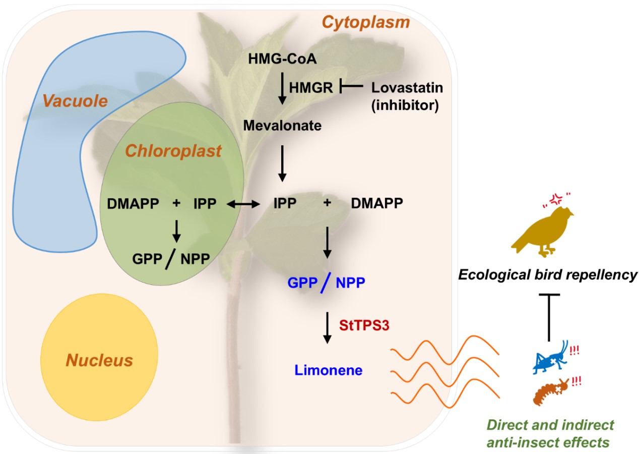 中国科学院华南植物园农业与生物技术研究中心曾兰亭等科研人员综合运用多种实验方法,系统鉴定了南美蟛蜞菊的关键抗虫单萜化合物,并阐明了其生物合成机制。研究发现,柠檬烯、α-水芹烯和对伞花烃是南美蟛蜞菊的主要挥发性单萜,占总量的80%以上,且具有显著的抗虫功能(用于抗虫评价实验的昆虫为鸟类主要食物来源)。体外酶活实验证实,细胞质定位的StTPS3具有广谱的底物选择性,能够同时利用香叶基焦磷酸(GPP)和橙花基焦磷酸(NPP)催化生成柠檬烯。代谢抑制实验进一步表明,甲羟戊酸(MVA)途径的抑制会显著降低单萜物质的释放,提示在细胞质中可能存在单萜合成途径(图1)。该研究首次从挥发性抗虫物质的角度揭示了南美蟛蜞菊在机场驱鸟及绿化管理中的应用潜力,为基于植物化感作用的鸟击防控策略提供了科学依据。