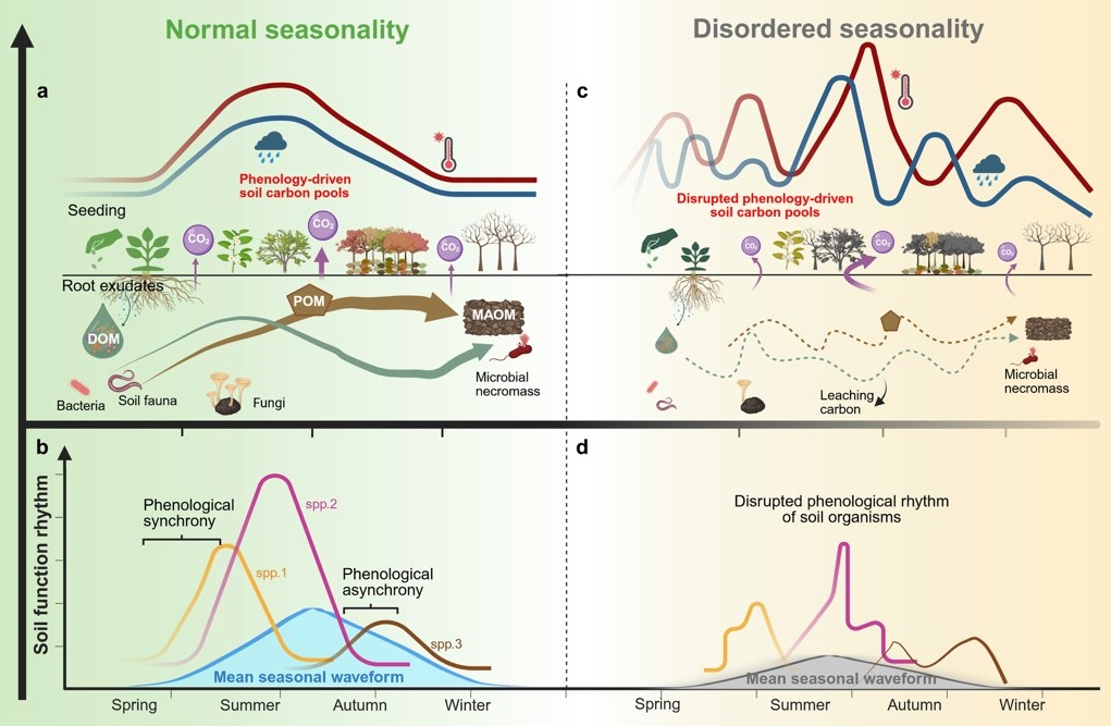 图. 气候驱动的季节性物候紊乱可能削弱土壤碳的持久性:(a)在正常季节条件下,地上与地下生物之间协调的物候节律调节着碳输入、微生物转化过程以及持久性矿物结合有机质的形成。土壤动物(如蚯蚓)示意性地代表了参与土壤碳转化的关键功能类群。DOM,溶解性有机质;POM,颗粒有机质;(b)土壤生物(例如,物种1-3)在不同季节表现出独特的物候活动模式,对土壤功能节律的贡献各不相同。平均季节波形反映了由多个类群产生的综合信号;(c)在季节秩序紊乱的情况下,气候变化破坏了这种同步性。植物、微生物和动物物候活动在时间和强度上的变化,可能导致碳输入与微生物需求脱节,分解连续过程碎片化,并改变营养级相互作用,最终降低土壤碳持久性和生态系统恢复力;(d)此类紊乱通过改变土壤生物的物候模式,可能使土壤功能节律趋于平缓并破坏其同步性。
