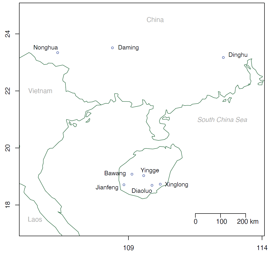 图1. 该研究的八个研究地点,包括三个大陆群落和五个海岛群落。