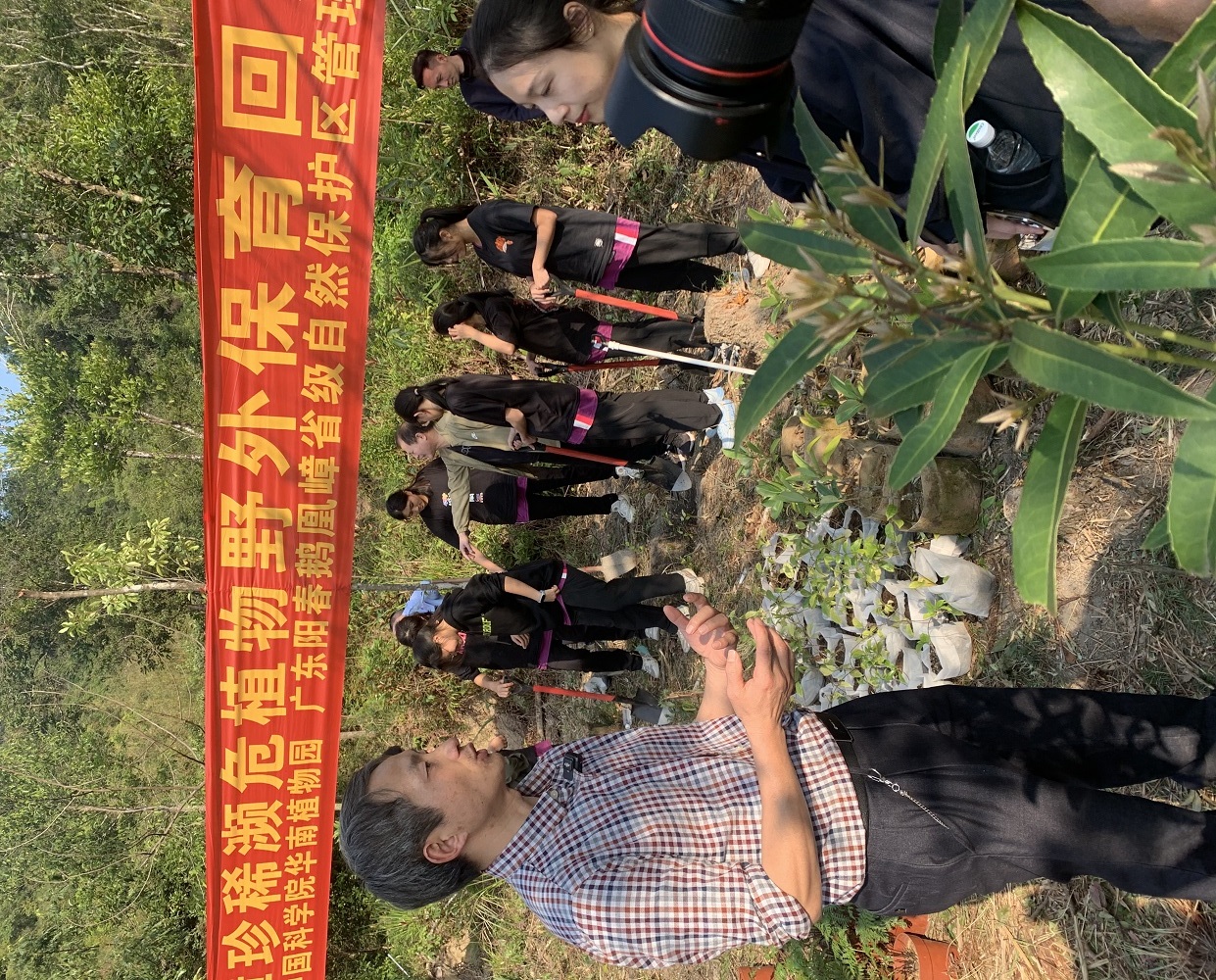 随后,参会代表在鹅凰嶂保护区开展了石碌含笑、巴戟天、中华桫椤、笔筒树、桫椤5种国家重点保护植物的野外保育回归活动,共同将200余株经过华南植物园繁育成功的种苗种植在保护区。